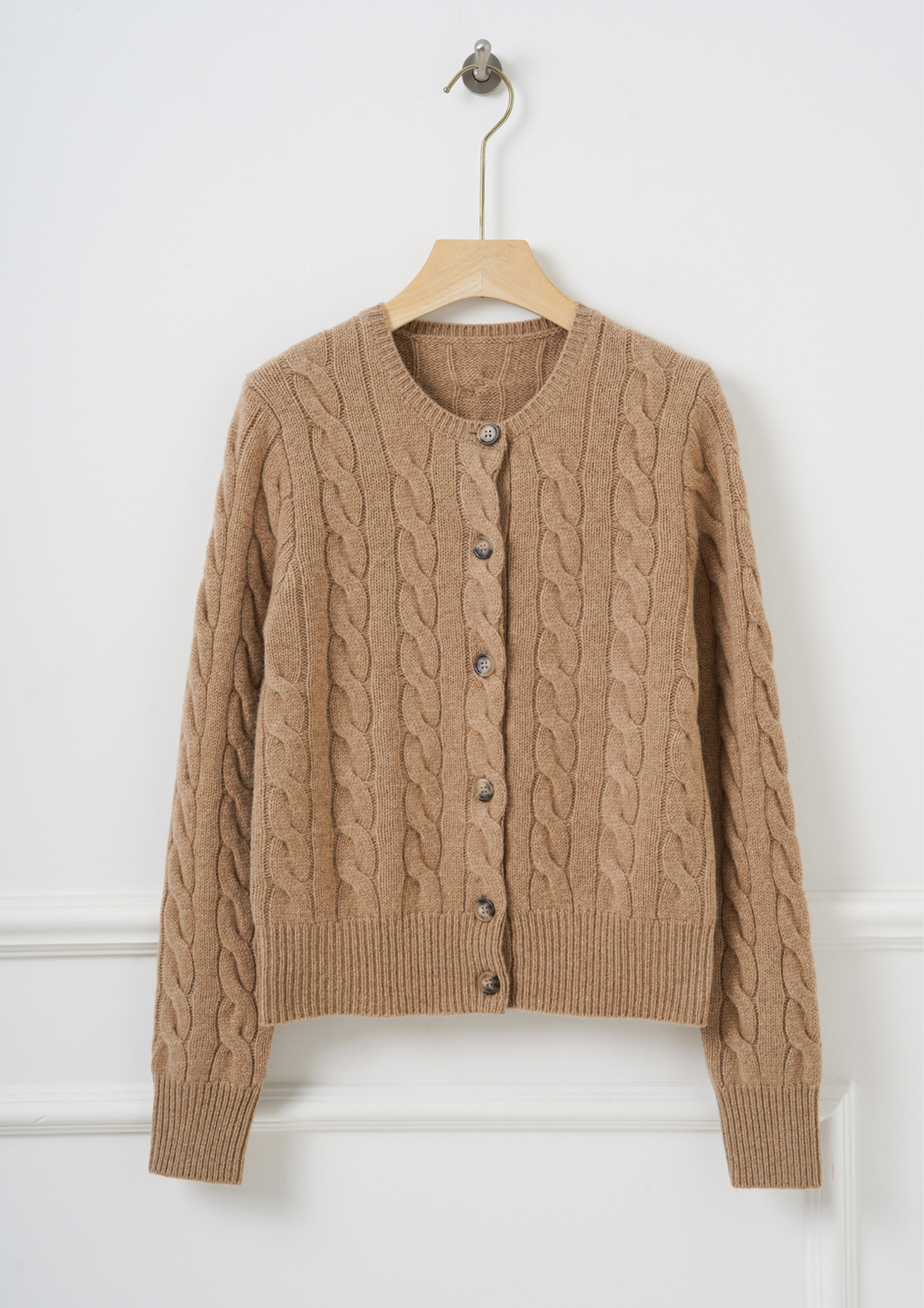 A timeless crew-neck cardigan crafted from soft wool-blend yarn, featuring a classic cable-knit texture and refined button-front design. Warm yet lightweight, it’s an easy layering piece for everyday wear.