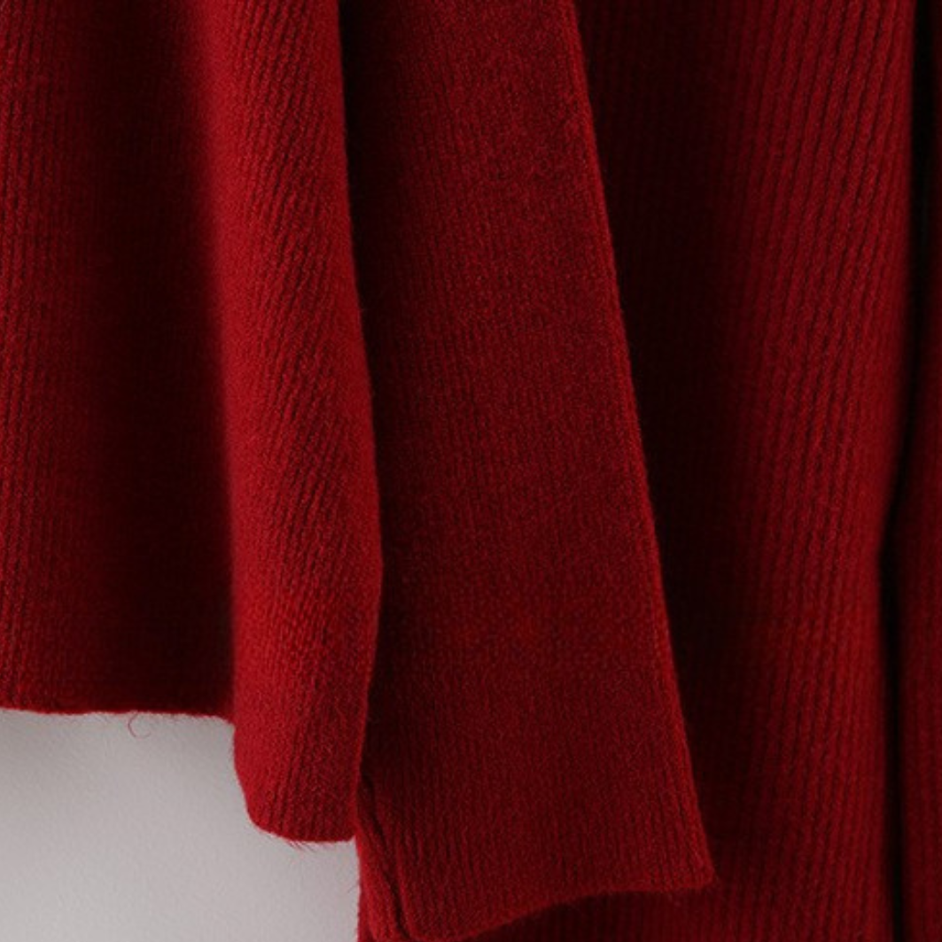 A soft ribbed knit with a loose turtleneck and relaxed pants — Ella brings timeless warmth and effortless off-duty chic.