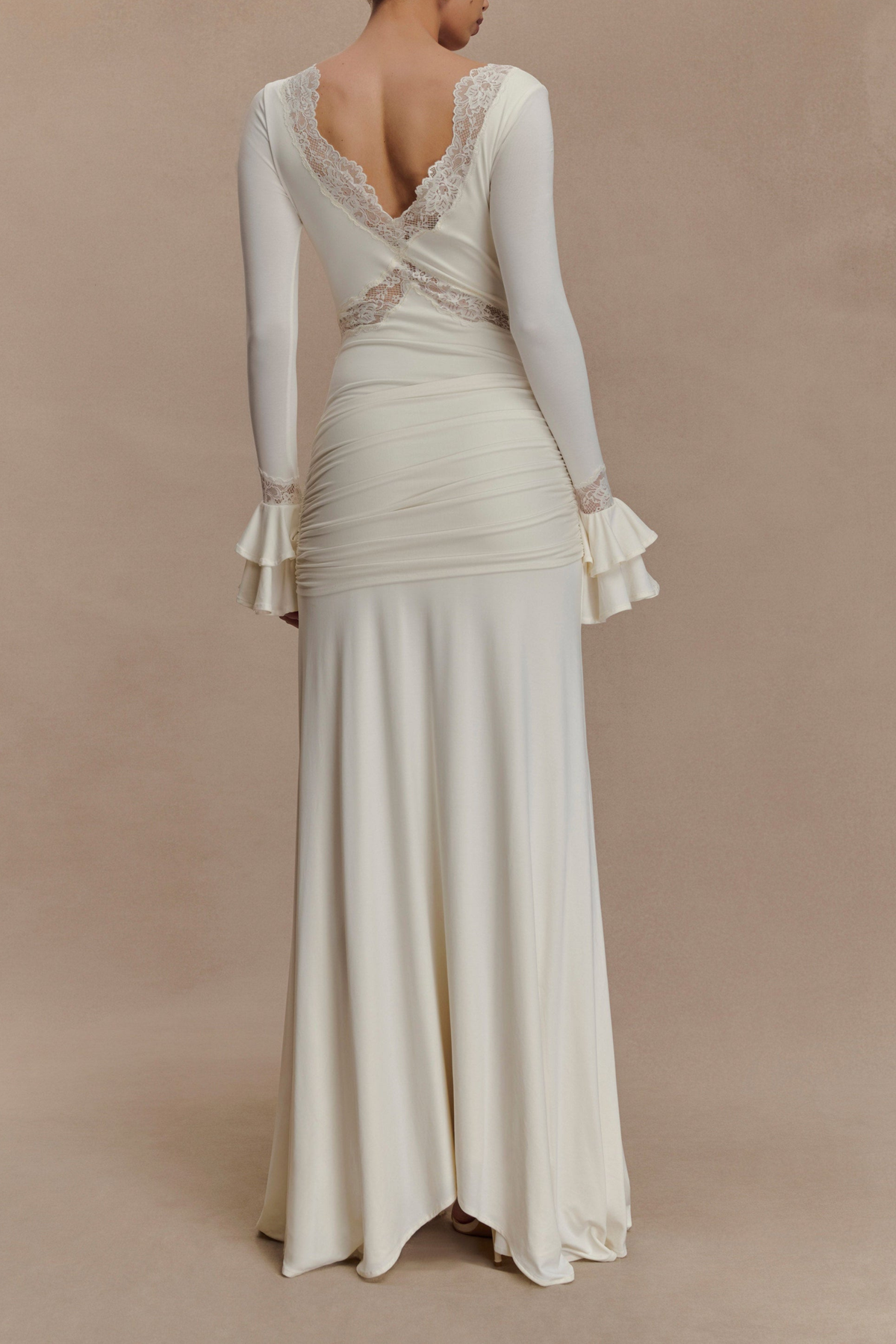 Ivory Draped Lace Trim Long Sleeve Maxi Dress