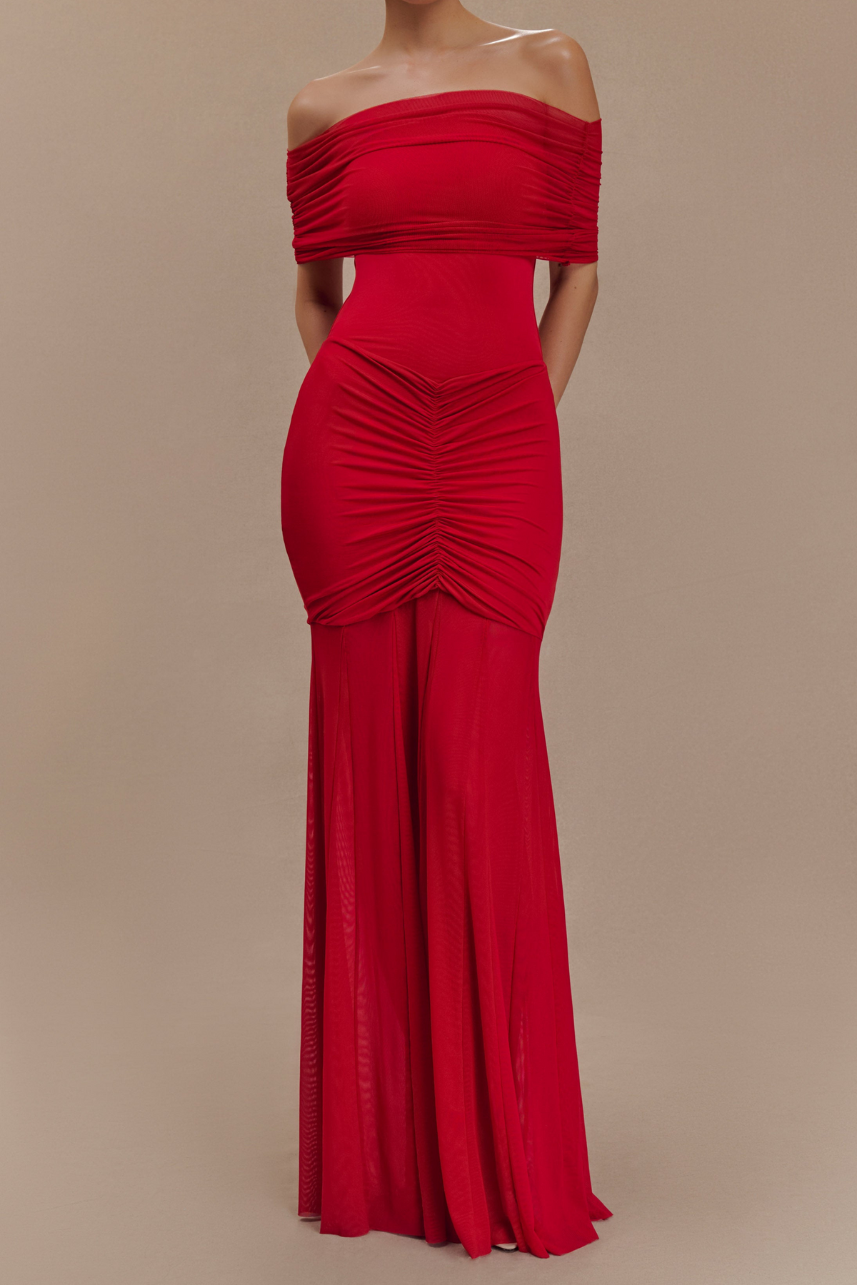 Body-hugging silhouette featuring strategic ruching at the bust and hips to accentuate curves.