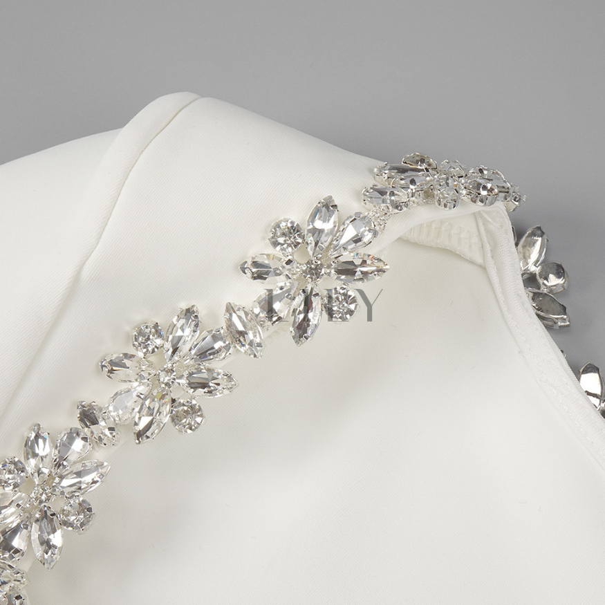 A refined white mini dress crafted in sculpted fabric, featuring a square neckline framed with hand-placed crystal floral embellishments. The long fitted sleeves balance the voluminous skirt for a clean, structured silhouette. Elegant, polished, and timeless — perfect for winter events, celebrations, and sophisticated evenings where subtle sparkle makes the whole look unforgettable.