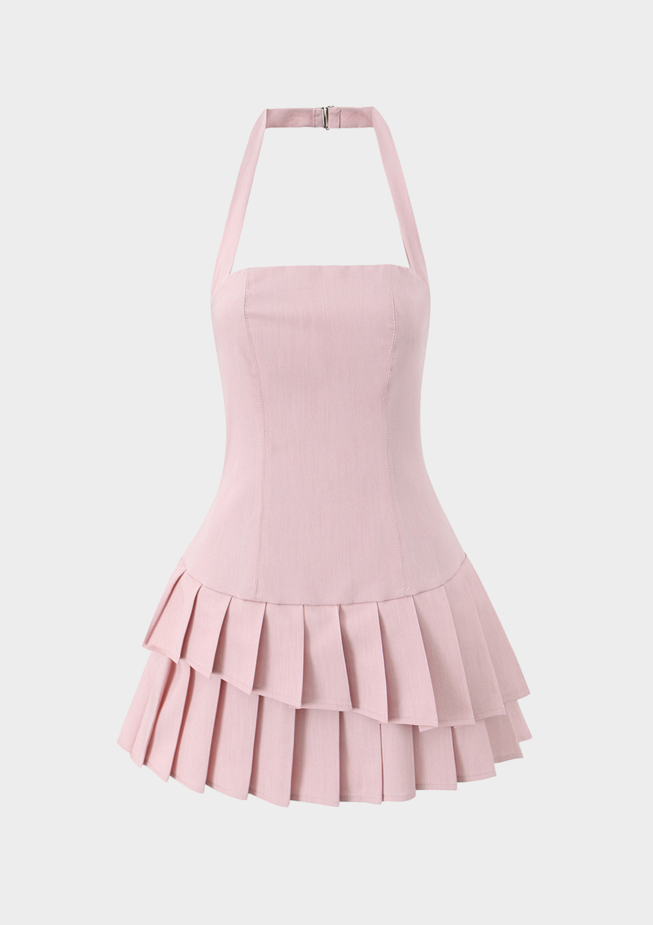 The Rosaria Mini Dress is crafted in a soft blush-pink tone with a sculpted halter neckline and a smooth, fitted bodice that flatters the waist. Finished with a tiered pleated hem, this mini silhouette adds movement and playful elegance while maintaining a clean, modern finish.