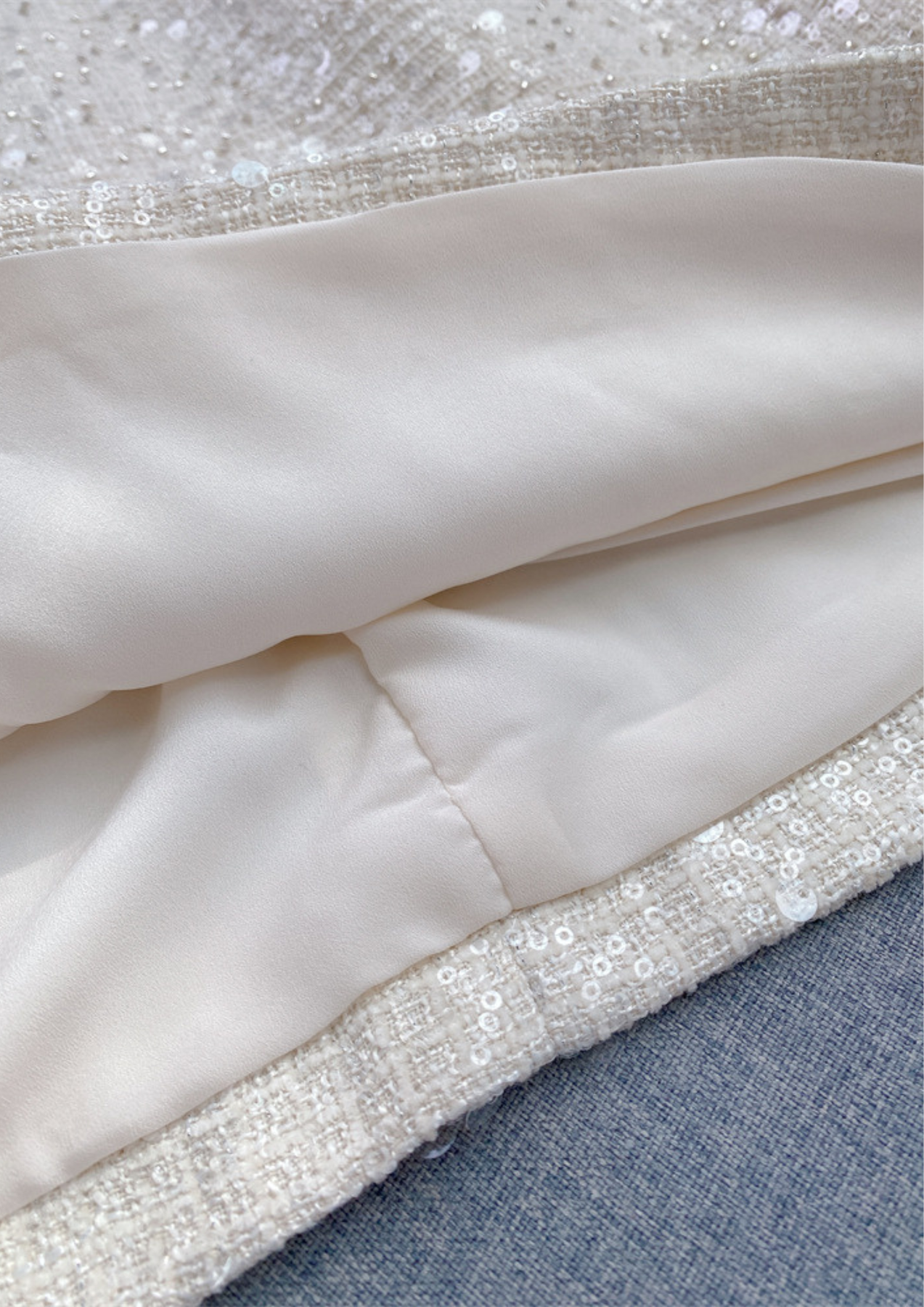 A refined ivory tweed mini dress adorned with shimmering sequins, featuring a pearl-trimmed round neckline, delicate open-waist cut-out details, and a statement pearl-encrusted bow at the waist—crafted to bring soft glamour and polished femininity to any occasion.
