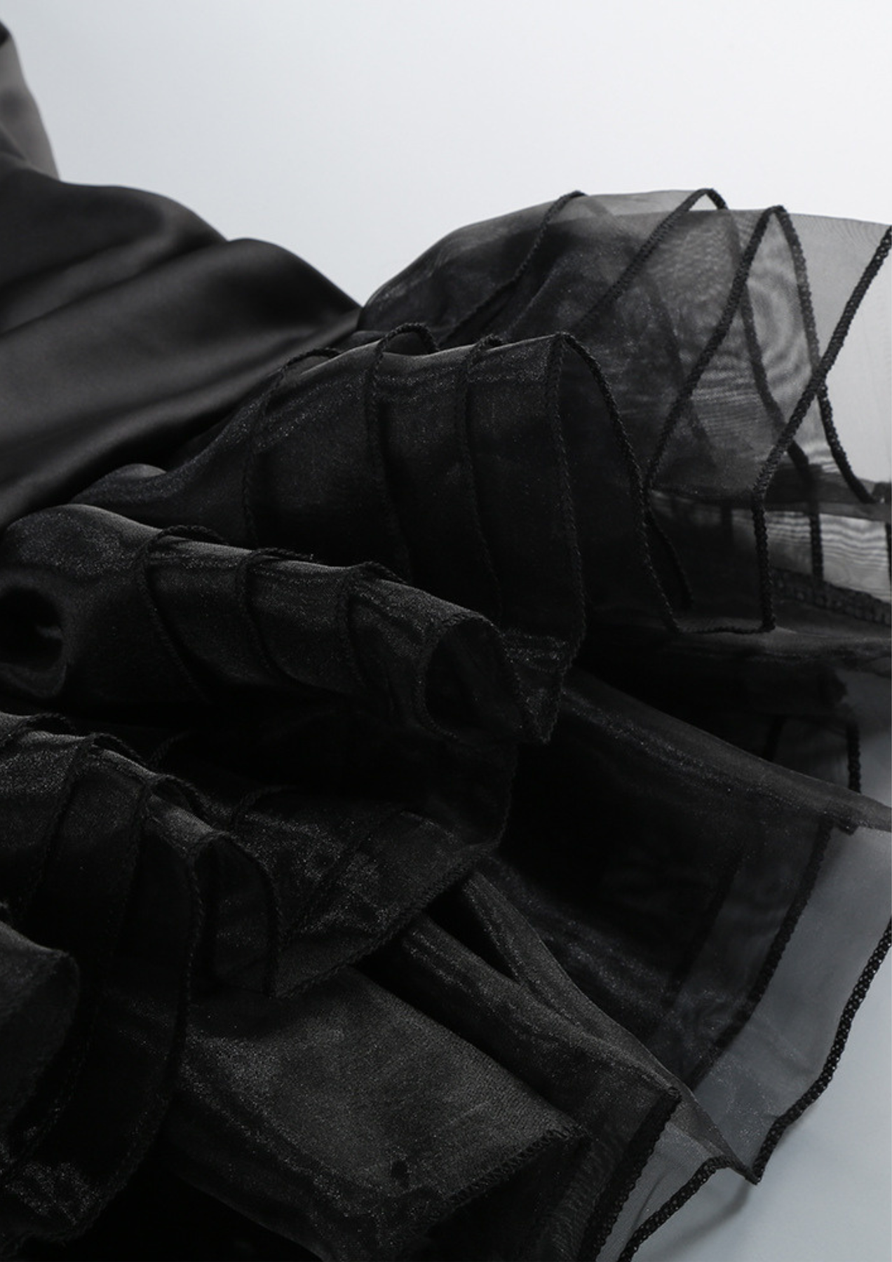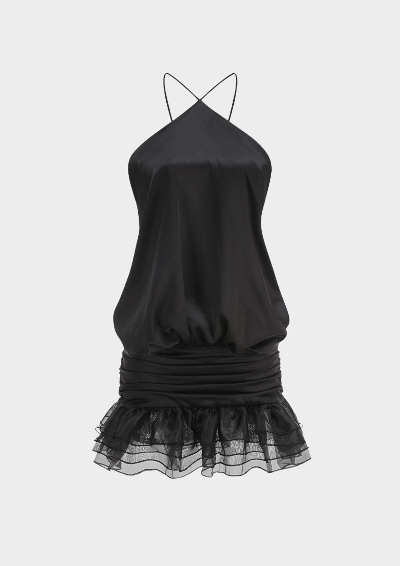 A bold statement mini designed to sculpt and flow in equal measure. This halter-style dress features a fluid, softly draped bodice that creates an effortless blouson effect, contrasted by a fitted ruched skirt that defines the waist and hips. The open-back silhouette is accented with delicate crossover straps and an adjustable tie closure for a customizable fit. Finished with a layered sheer mesh ruffle hem, this black mini blends softness with striking evening allure.