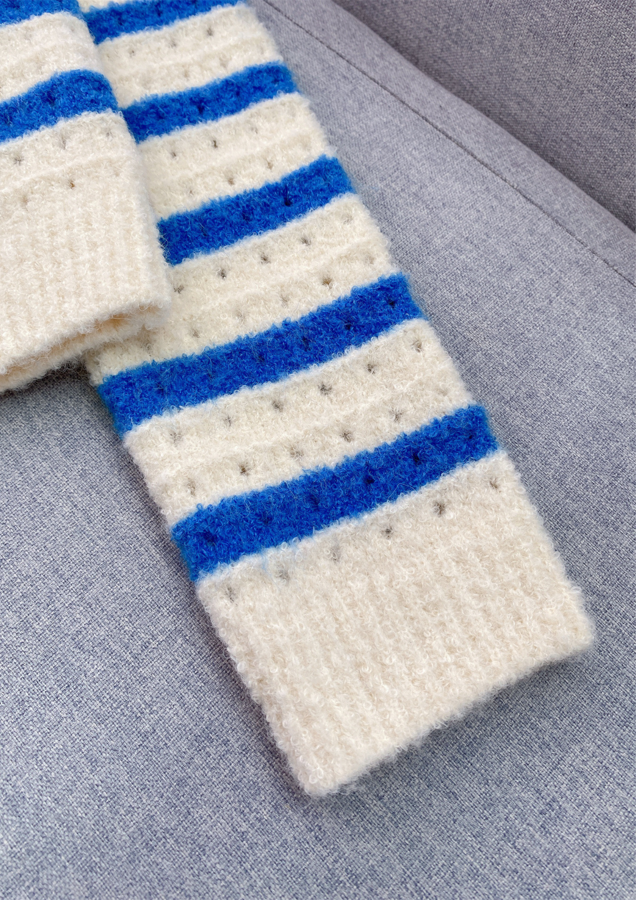 A youthful and cozy striped knit cardigan featuring a soft textured feel, a vintage-style collar, and vibrant blue-and-white stripes for an effortlessly cute everyday look.