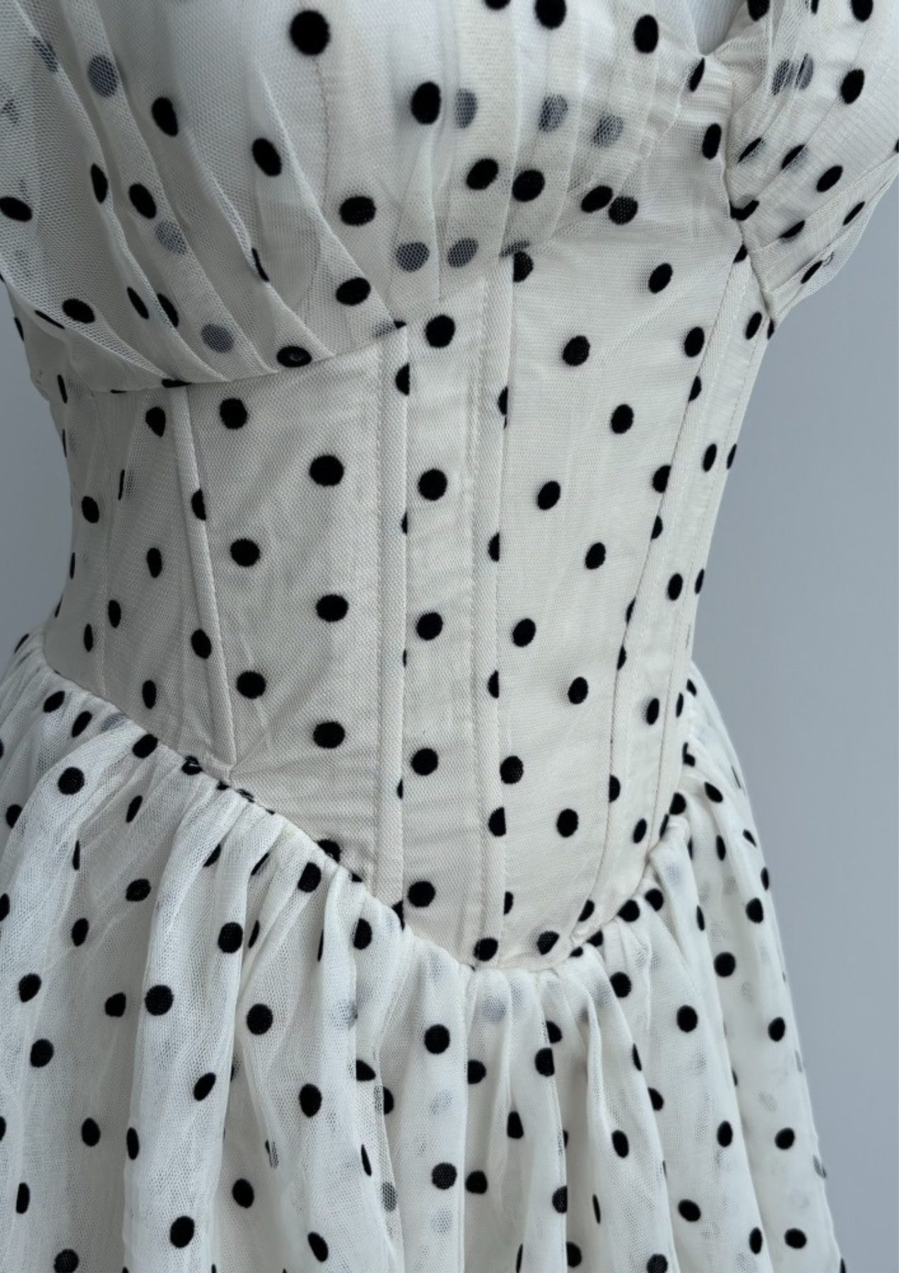 A dreamy, vintage-inspired halter maxi dress crafted in soft ivory with classic black polka dots. The plunging halter neckline enhances the décolletage while the fitted, corset-style bodice cinches the waist for a beautifully sculpted silhouette.