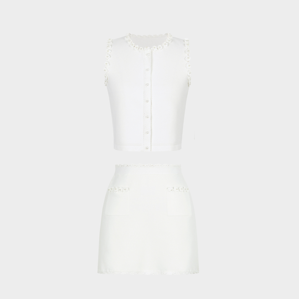 Lily – Pearl Button Floral Knit Ruffle Skirt Viscose Set In Beige