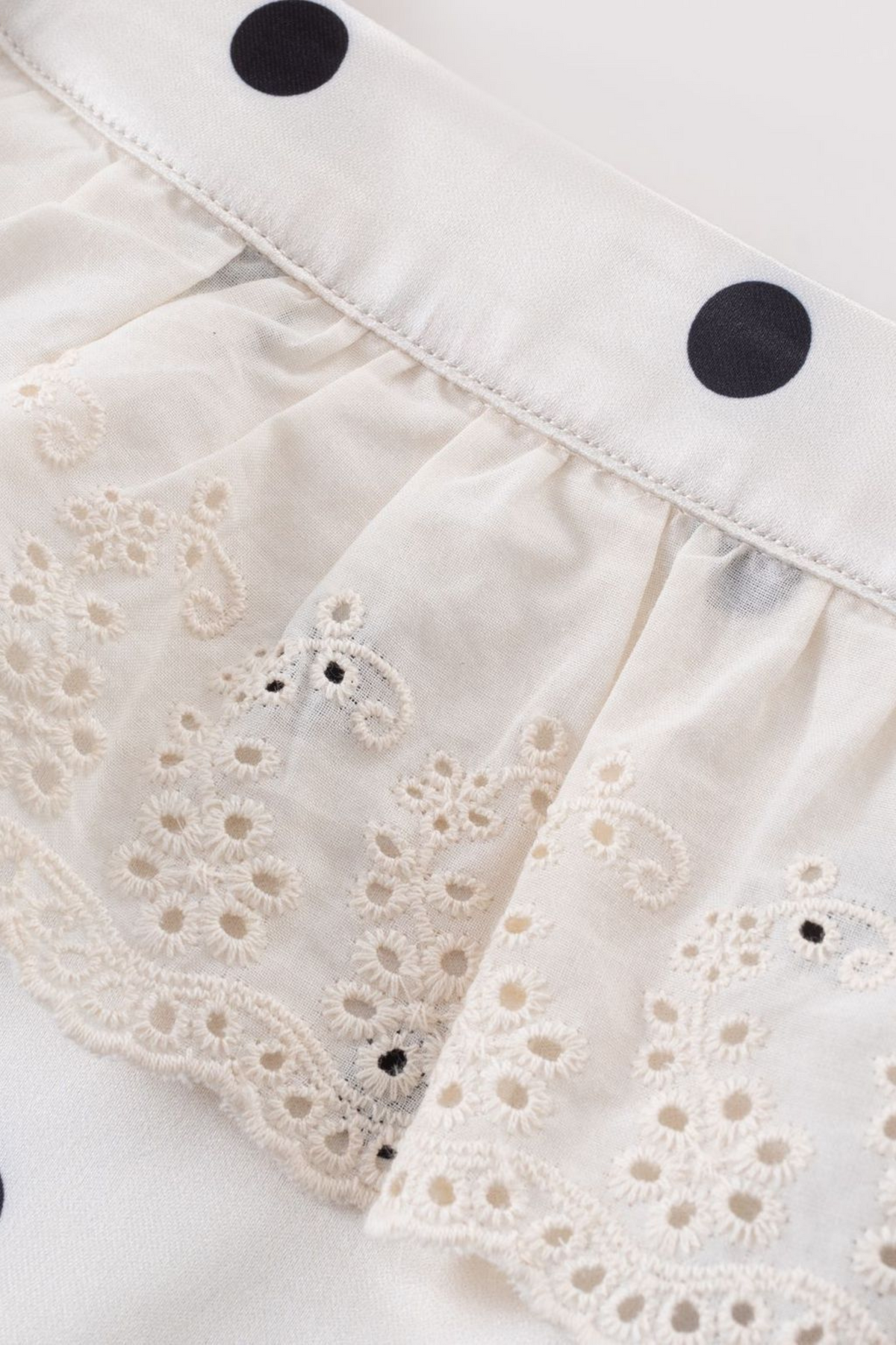 Soft satin-like fabric with classic black polka dots on white for a timeless chic look.