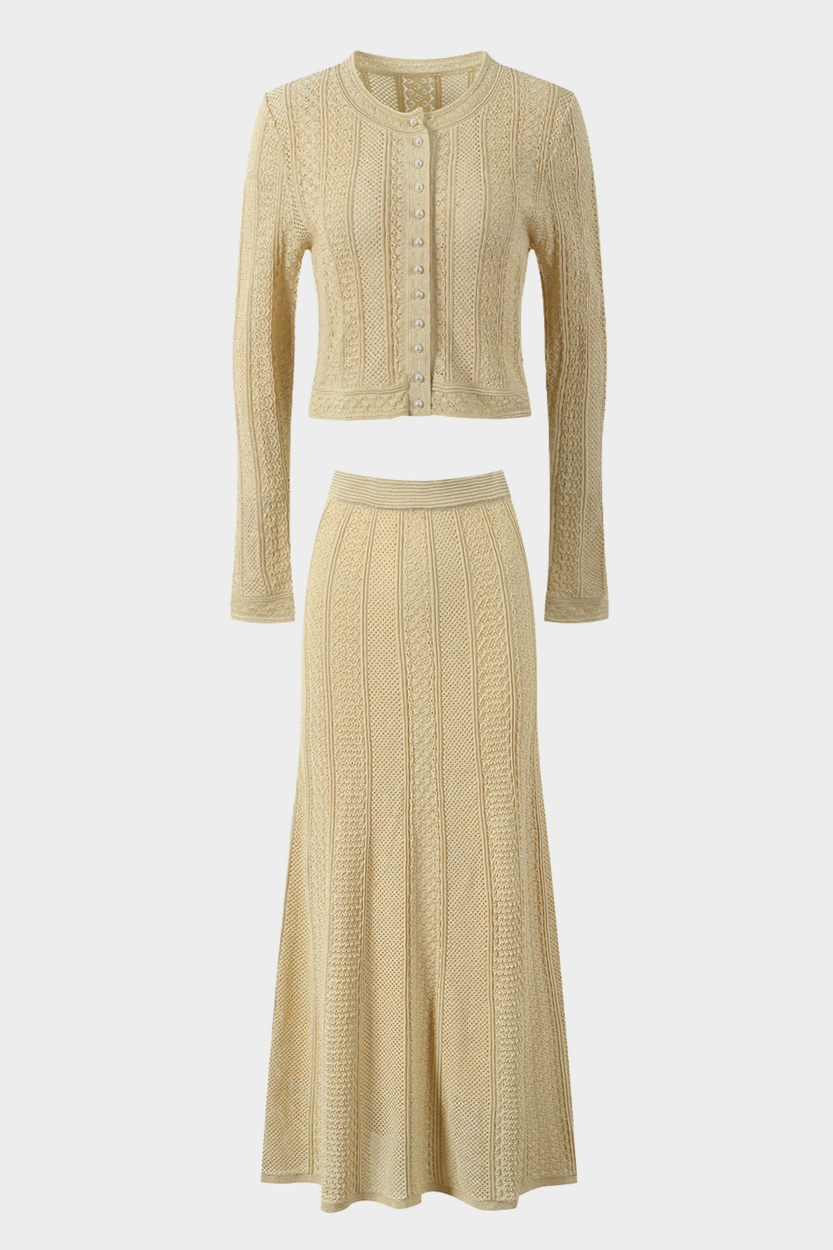 Beige Hollow Knitted Viscose Pearl Button Cardigan & Maxi Skirt Set