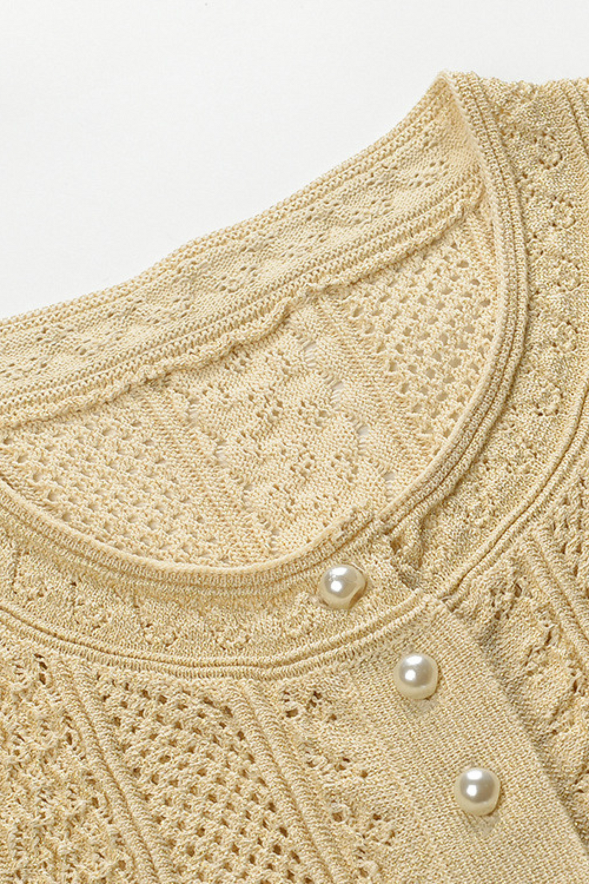 • Cardigan: Cropped silhouette with delicate pearl button closure, round neckline, and intricate textured knit patterns that blend sophistication with modern charm.
