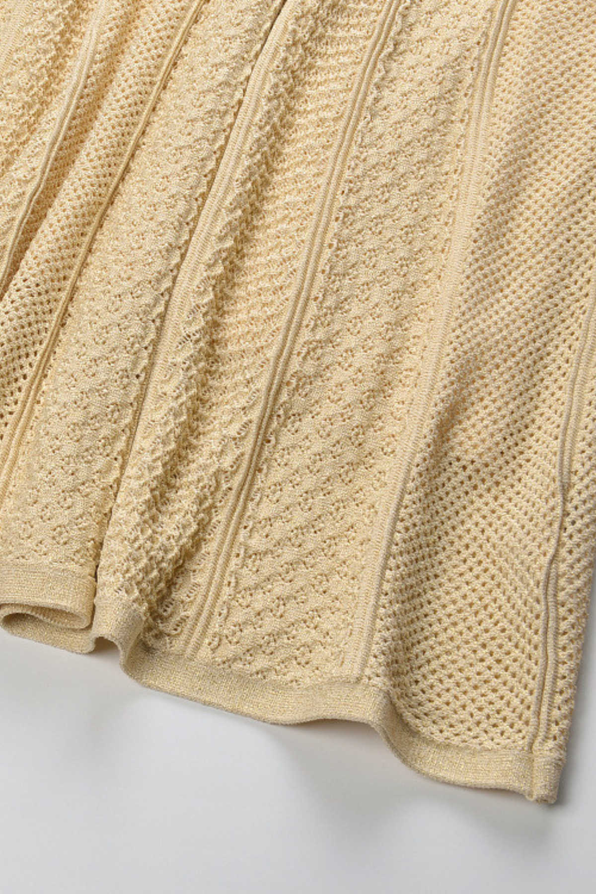 • Skirt: Flowing maxi length with elastic waistband for comfort, featuring vertical hollow knit panels that elongate the figure and add graceful movement.