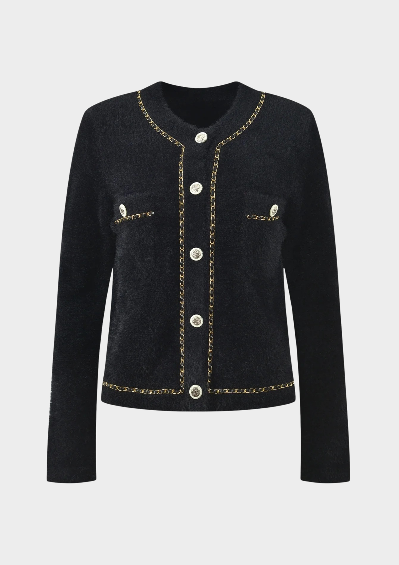 Wrap yourself in soft elegance with this chain-embellished knit cardigan — a chic, feminine layer that elevates every outfit. Crafted from a plush, lightweight knit, it features a beautifully textured finish, soft fuzzy feel, and gold-tone chain detailing woven along the neckline, placket, and pockets for a sophisticated, couture-inspired touch.