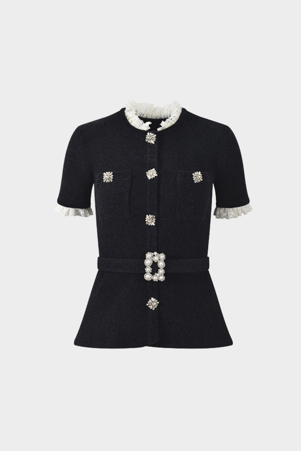 Crafted from soft black velvet knit for a rich, luxurious feel Short-sleeved design with delicate white lace ruffle collar and sleeve trims Statement crystal and pearl embellished buttons for a high-end look Waist belt with a jeweled buckle to define and enhance the silhouette Structured, tailored fit offering a flattering and elegant shape Versatile piece ideal for elevated daytime looks or sophisticated evening outfits