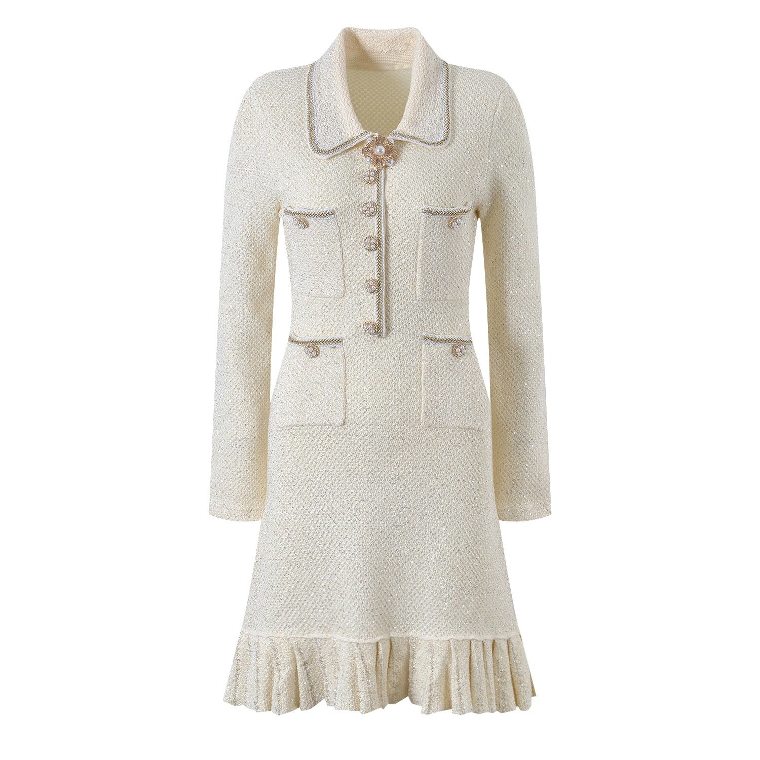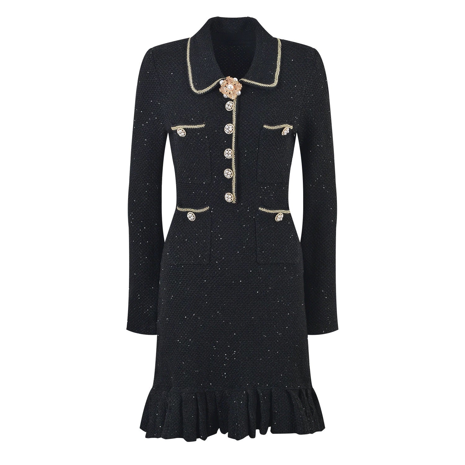 A luxurious wool-blend sequin mini dress featuring pearl-trimmed buttons, a structured collar, and a soft ruffled hem for an ultra-elegant winter look.