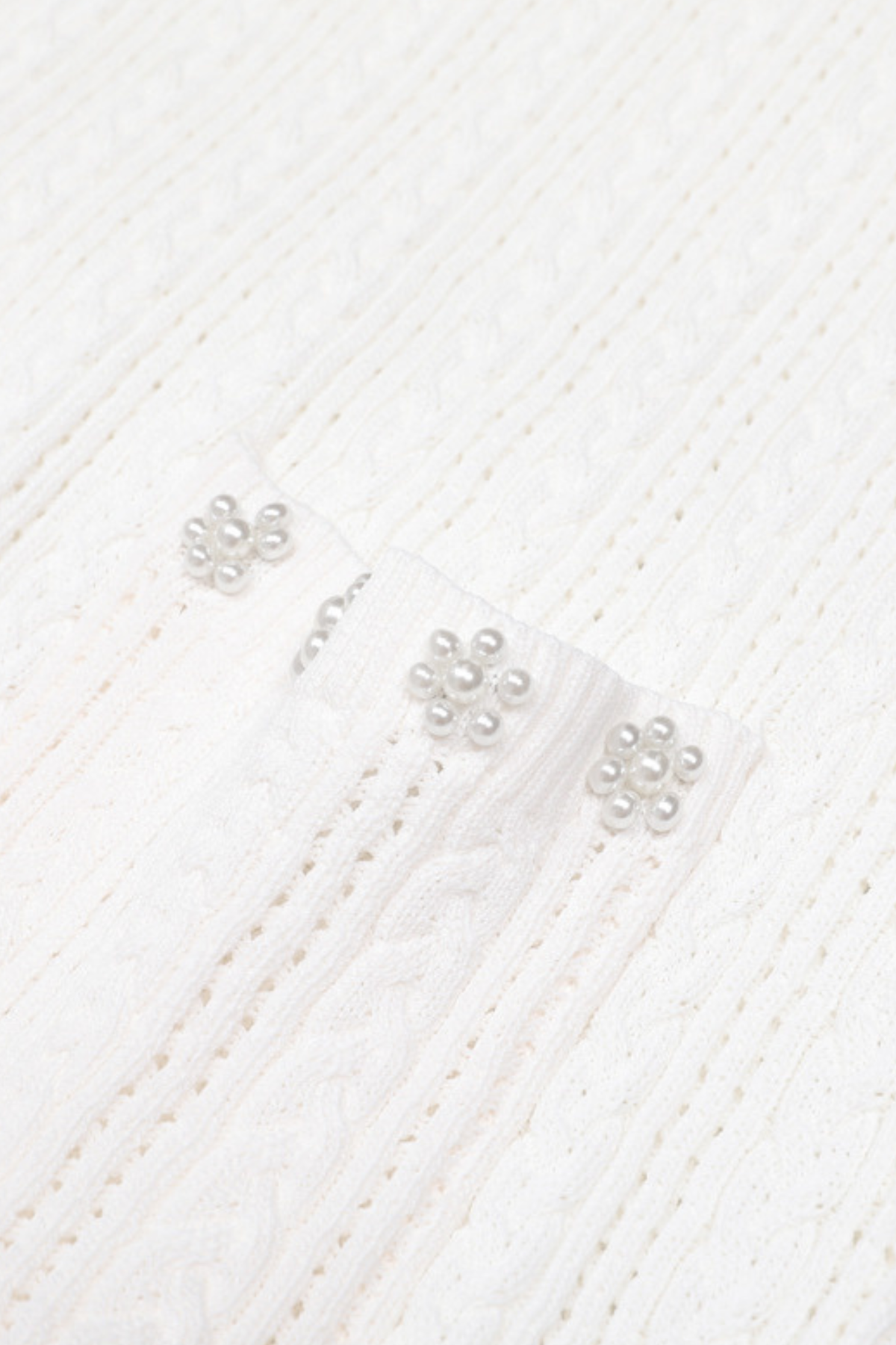 Delicate pearl flower embellishments around neckline, shoulders, and waist for a refined, feminine touch.