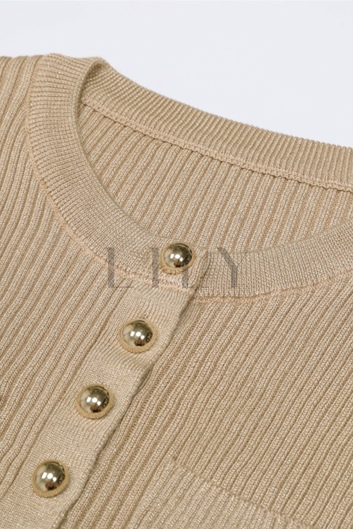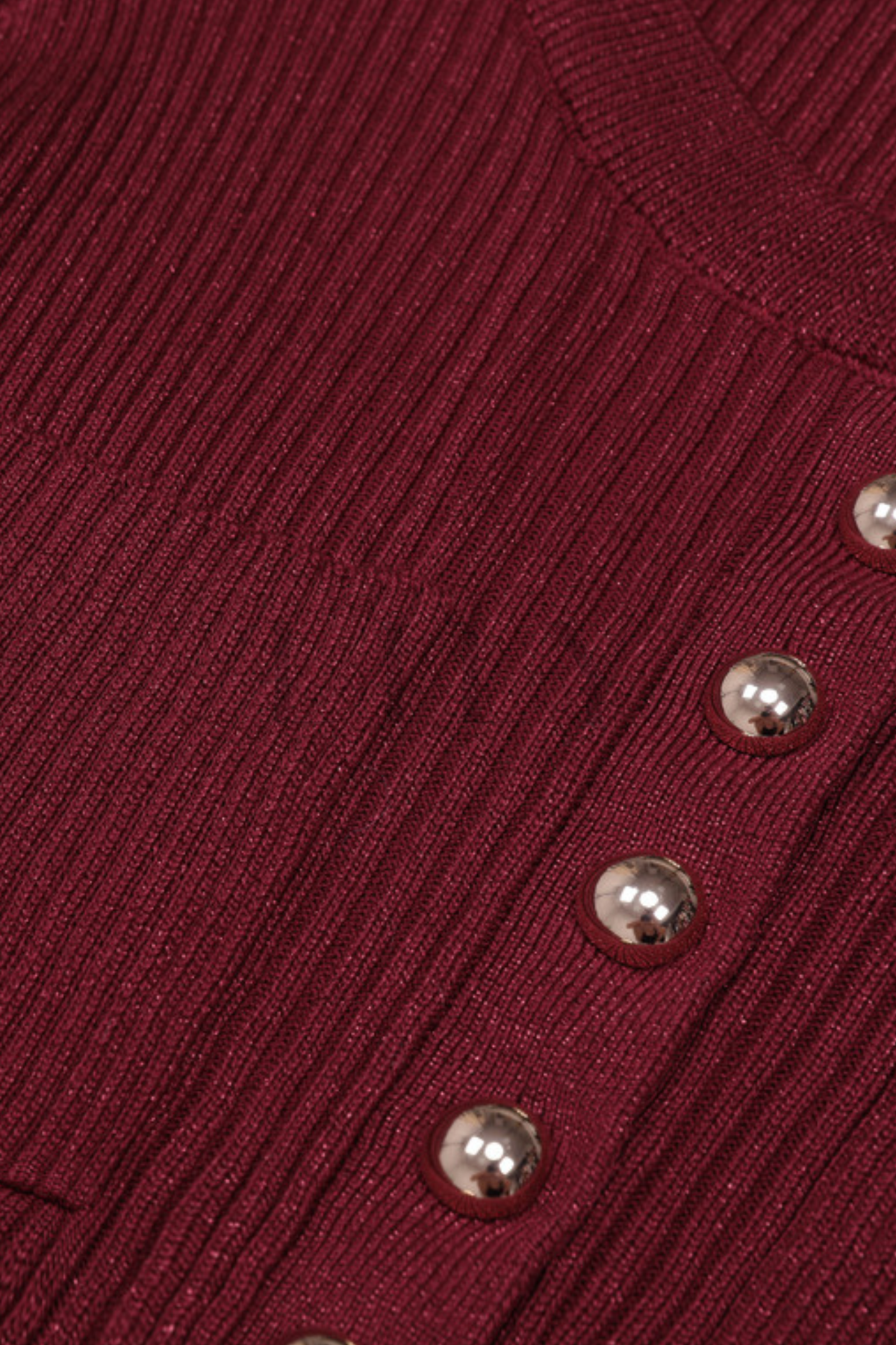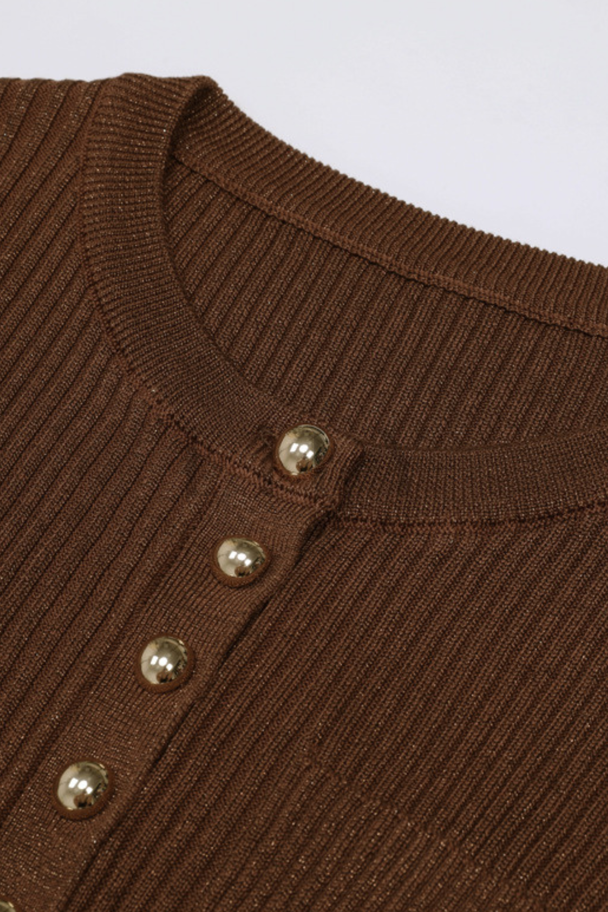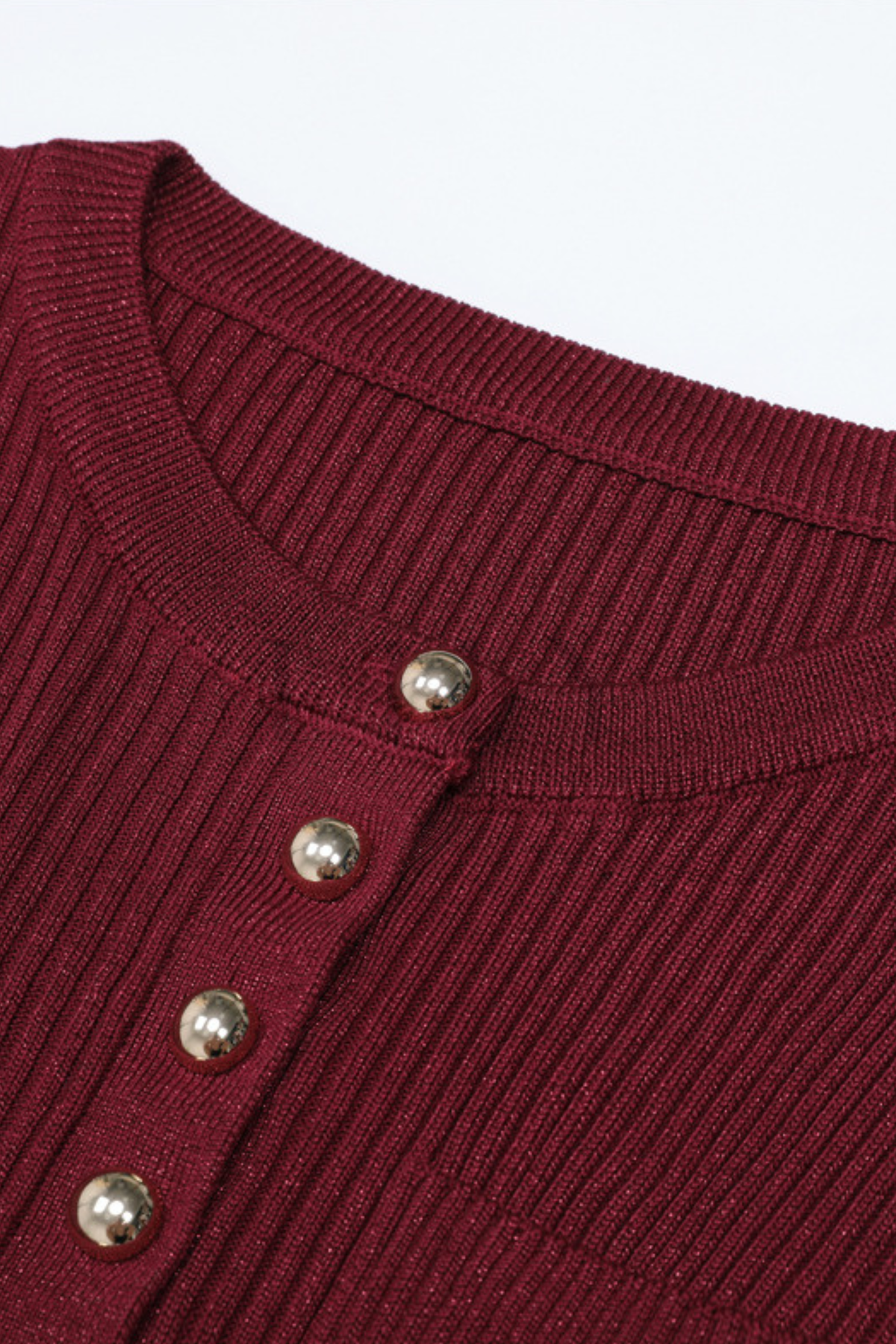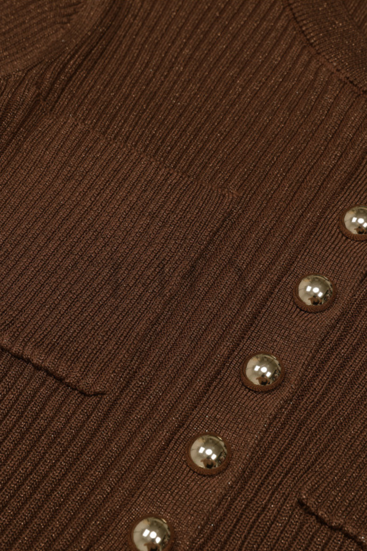 Sweater includes gold-tone statement buttons, rib-knit texture, and delicate flared cuffs for a feminine touch.