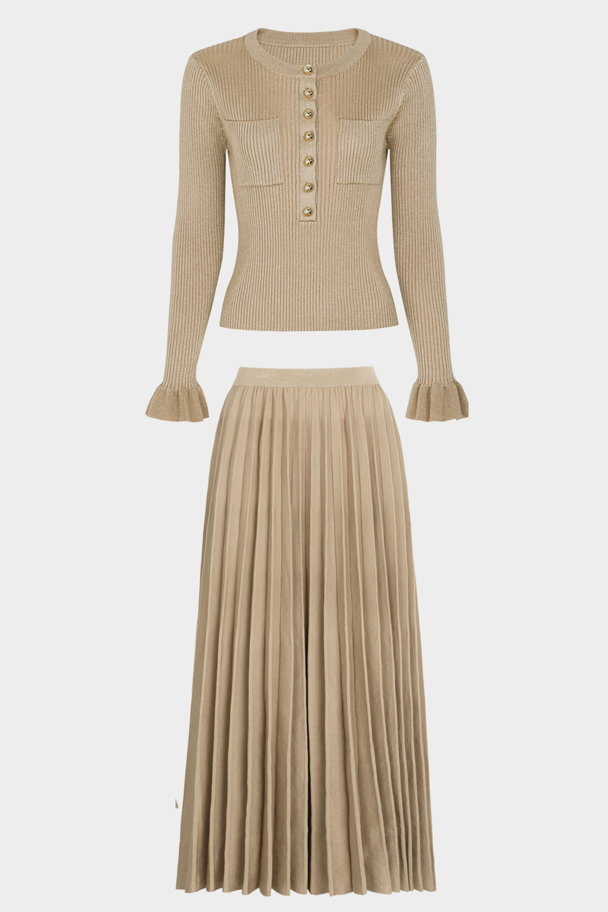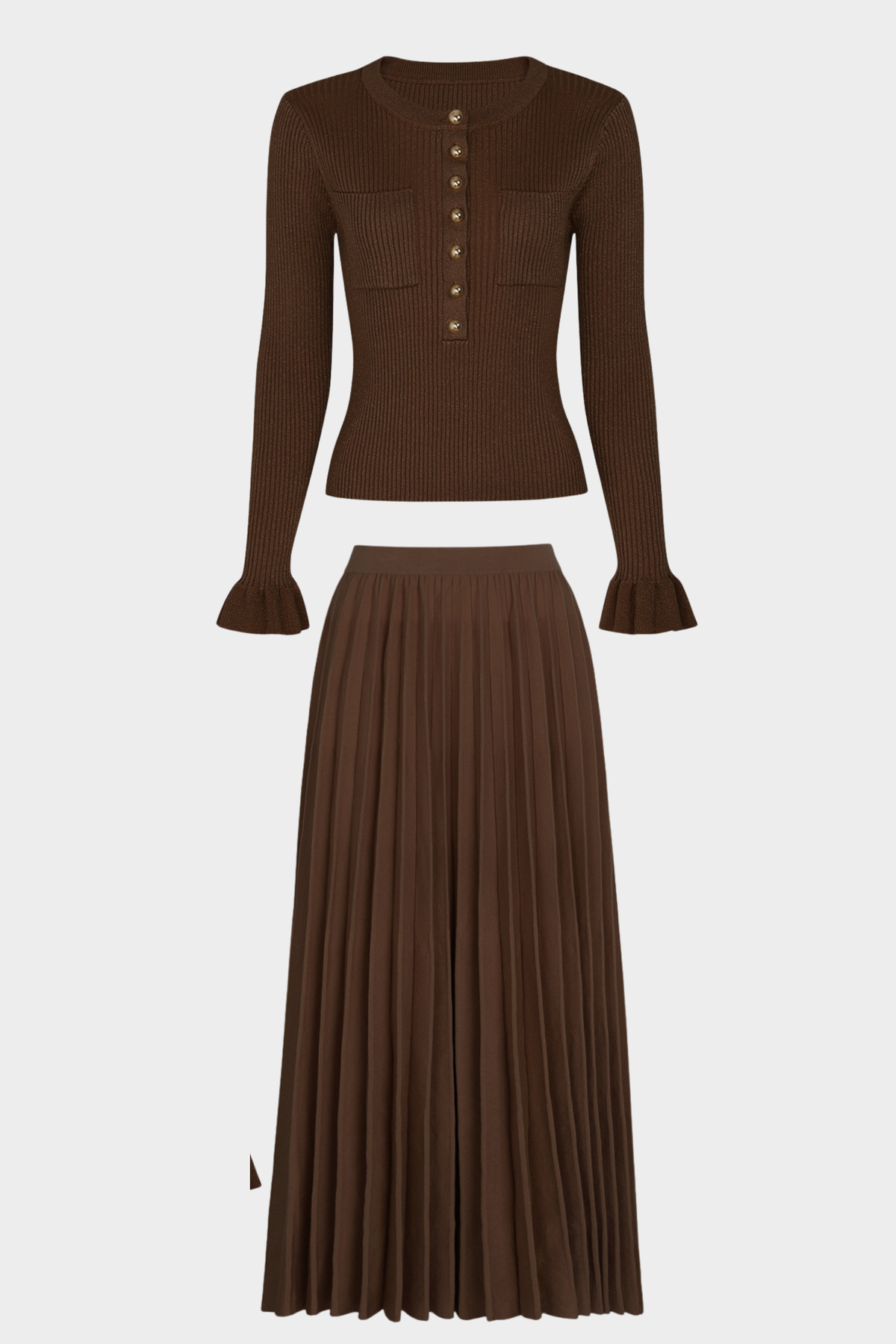 Elegant two-piece set featuring a fitted knit sweater and flowing pleated skirt.