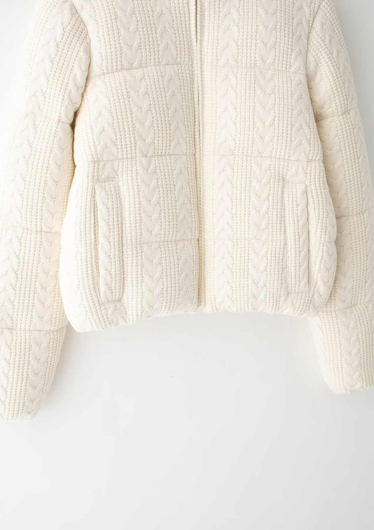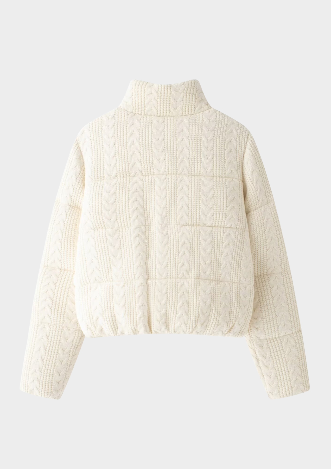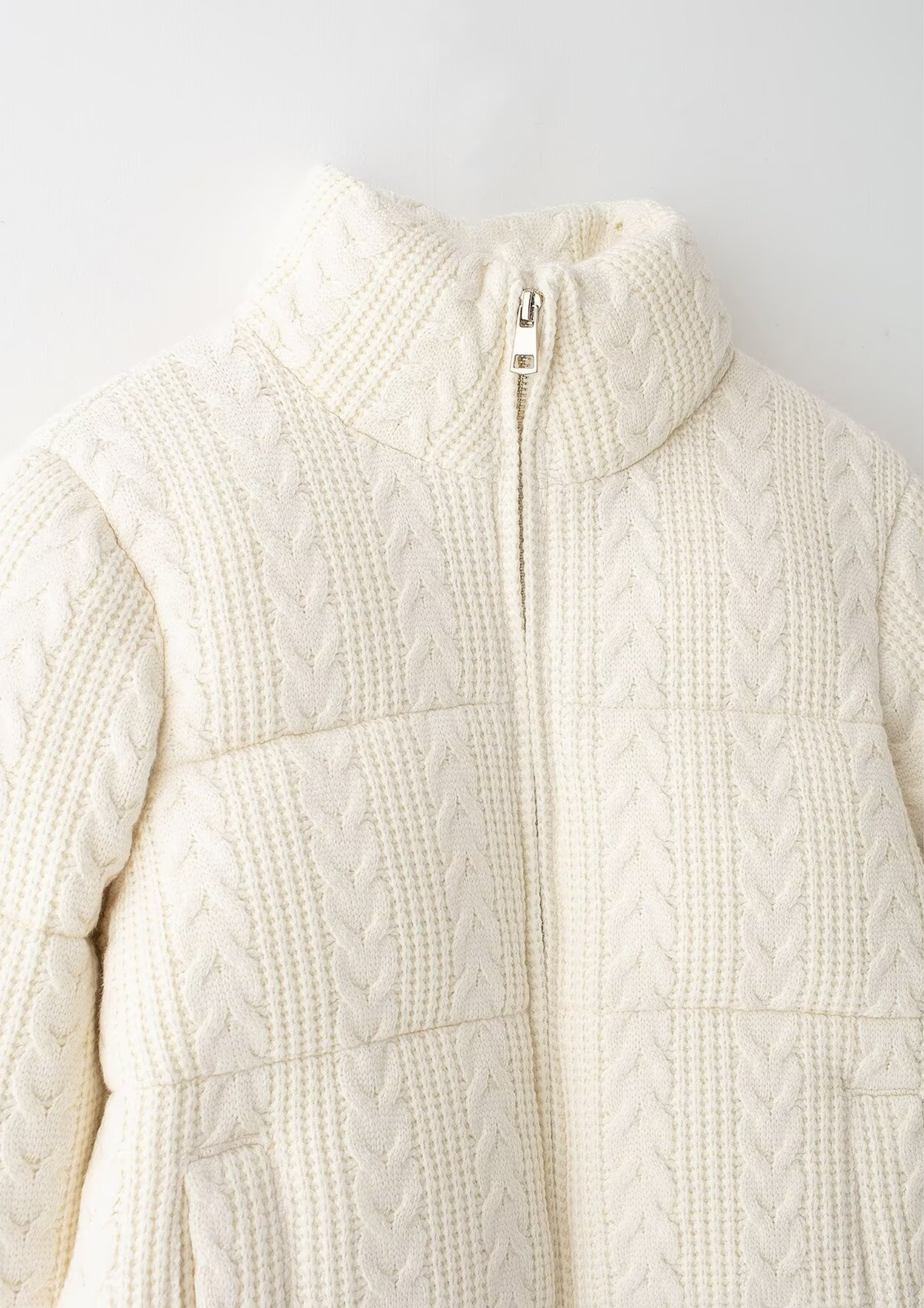 This zip-up jacket is crafted from soft knitted cotton fabric with a classic cable-knit texture. Designed with a structured yet cozy silhouette, it features a high stand collar, full front zipper, and long sleeves for warmth and comfort. The cropped length and subtle padding give it a modern, elevated look—perfect for layering during cooler seasons.