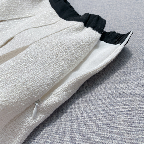 An elegant tweed skirt designed with soft pleats and subtle shimmer, combining refined texture with graceful movement for a polished feminine look.